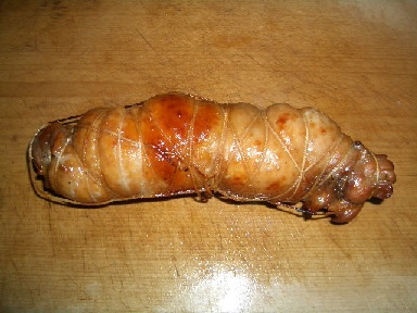 4、皮を外側にしてくるくると巻いて凧糸で縛る