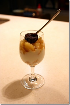 お楽しみのデザートは、リンゴとプルーンのシリアル です。一口サイズのリンゴにレモン汁をからませ、ハチミツ、サラダ油を混ぜ、シリアルとヨーグルト、プルーンの入った器にのせた甘くておいしい一品です。甘いデザートの後には、お口直しの決明子のお茶。はと麦も入っているので非常に飲みやすいです。