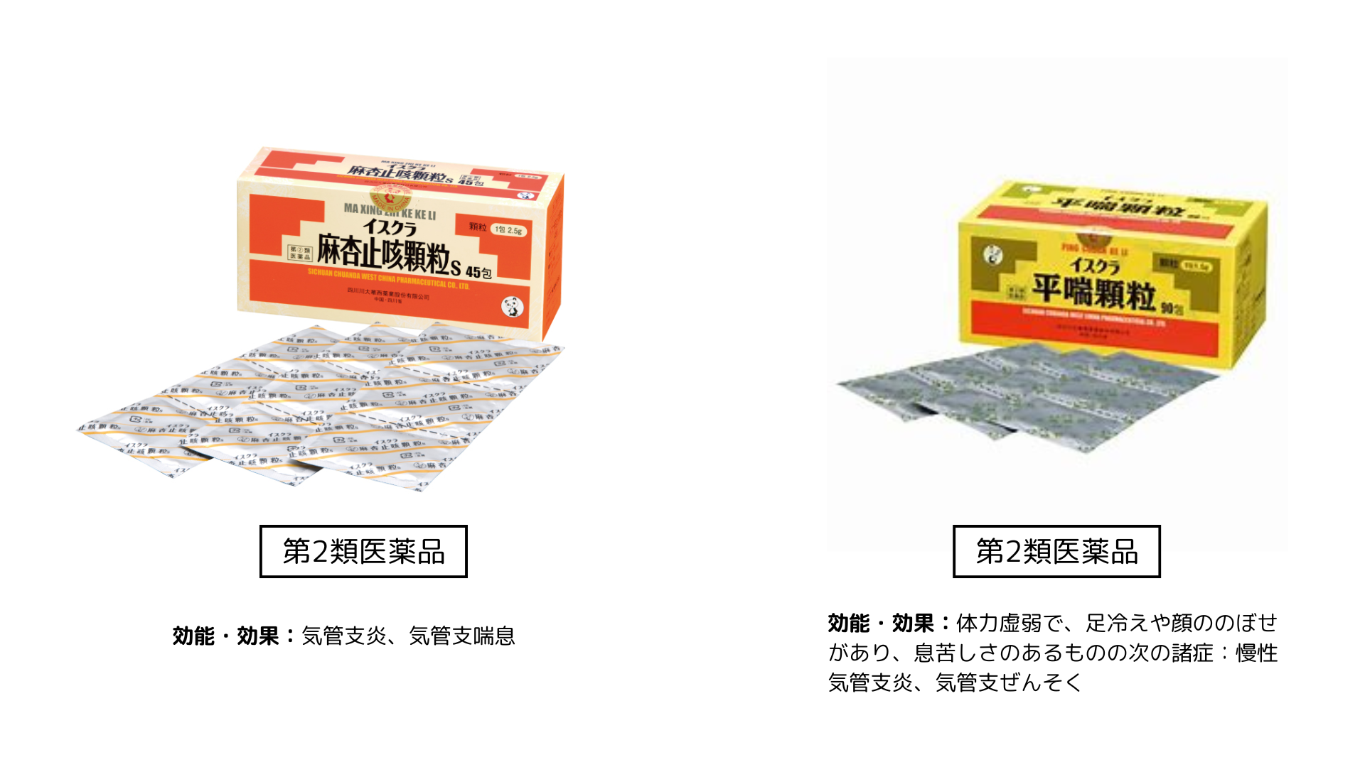 おすすめ漢方:イスクラ麻杏止咳顆粒(まきょうしがいかりゅう・ゼイゼイする咳、痰が絡む咳に)、イスクラ平喘顆粒(足冷えを伴う慢性的な息苦しさに)