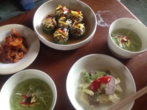 その他、韓国カボチャの詰め物(ホバクソン)やイカの甘辛炒め(オジンオポックム)、松の実ソースの野菜サラダ(ヤチェチャッソスセルロドウ)、きゅうりの冷製スープ(オイネングッ)など一緒に作って美味しくいただきました。