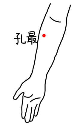 まず一つ目は、孔最(こうさい)というツボで手の太陰肺経に属します。
